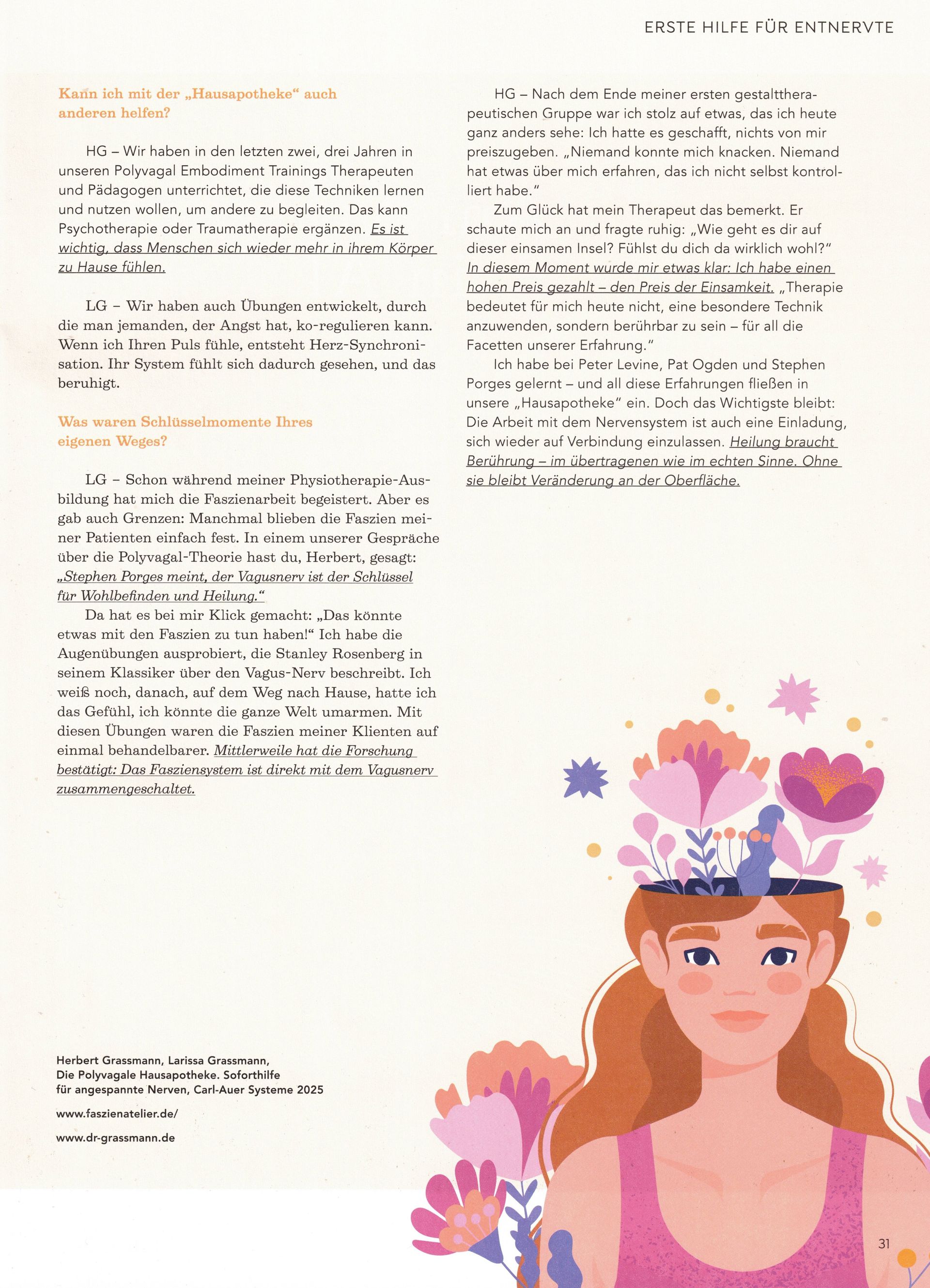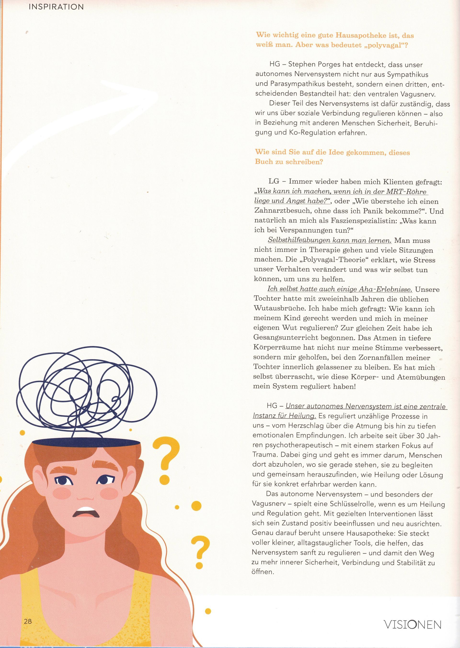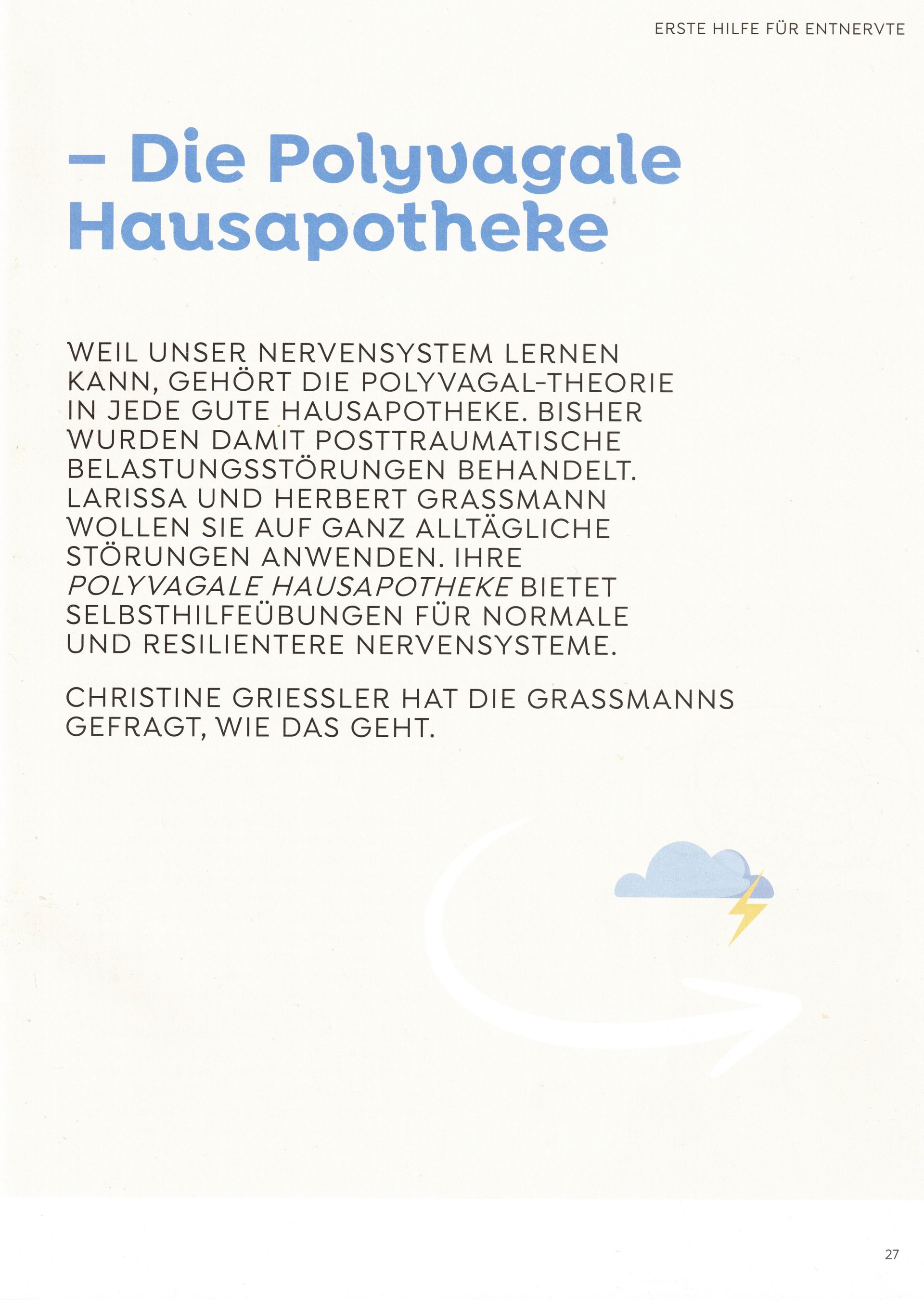 "Dieses Buch ist eine wichtige Untersuchung der tiefgreifenden Verbindung zwischen Geist und Körper. Es basiert auf den neuesten Erkenntnissen der Neurowissenschaften, ist jedoch sehr praxisorientiert und menschlich. Larissa und Herbert Grassmann zeigen, wie einfache somatische Übungen wie bewusstes Atmen und das Einstimmen auf unsere Sinne das Nervensystem regulieren können. Basierend auf dem bahnbrechenden Rahmenkonzept der Polyvagaltheorie zeigt dieses Buch, wie wir nicht nur unsere Gesundheit, sondern auch unsere emotionale Widerstandsfähigkeit und unser Wohlbefinden verändern können. Ich empfehle es von ganzem Herzen Fachleuten und Laien, die auf der Suche nach einem vertrauenswürdigen, inspirierenden Leitfaden für ganzheitliche Heilung sind."